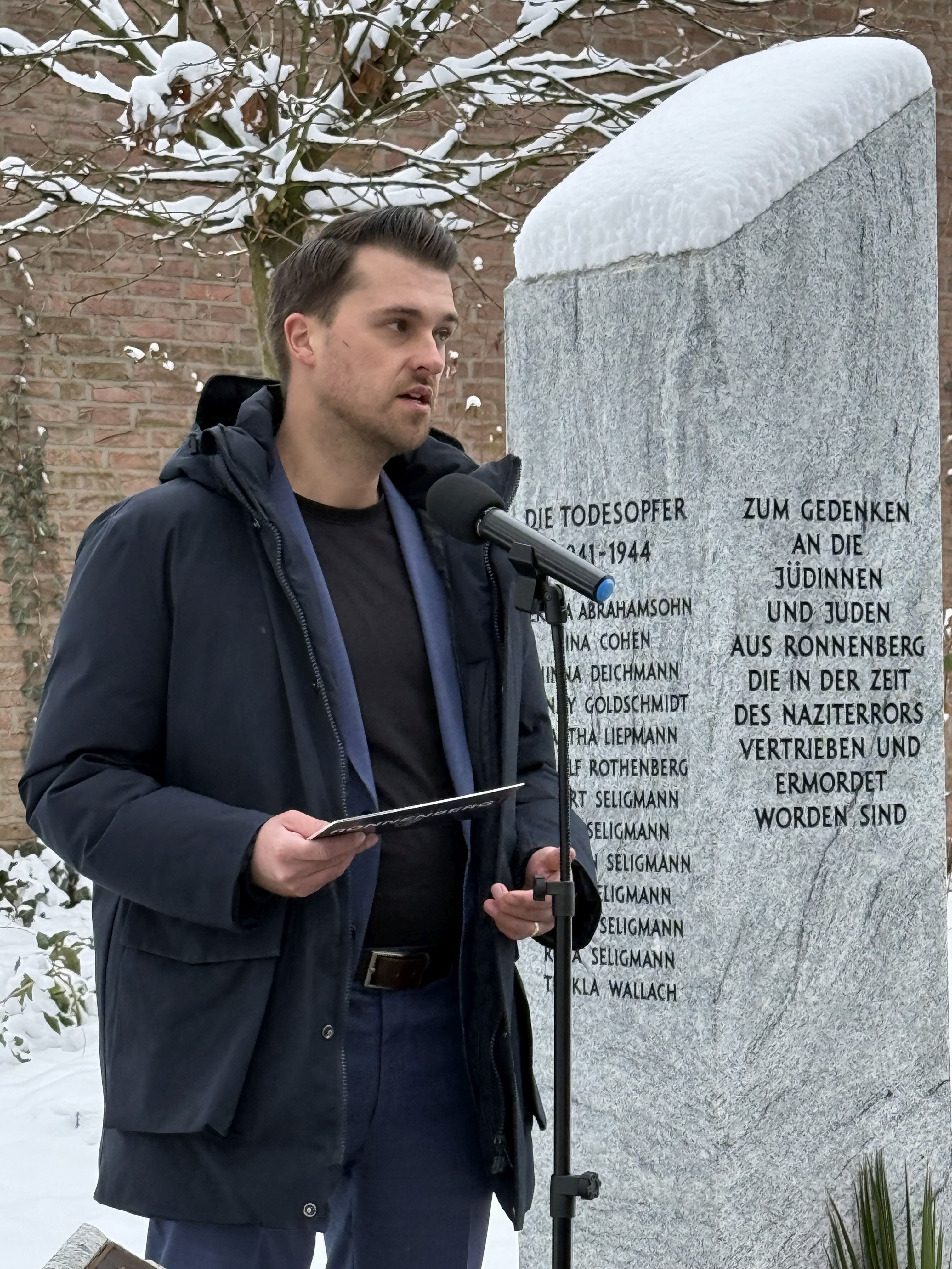 Und nun wird zunächst Marlo Kratzke eine Ansprache für die Stadt Ronnenberg halten. Dann spricht Mike Nebowsky für die Marie Curie-Schule und anschließend beteiligt sich die Klasse E3 wieder aktiv an dem Gedenken. Die Schülerinnen und Schüler haben verschiedene Redebeiträge zum heutigen Tag vorbereitet. So werden sie zum Beispiel über den historischen Kontext des Gedenktages berichten, das Vernichtungslager Auschwitz thematisieren, aber auch vor allem die Auswirkungen des Holocaust auf das jüdische Leben in Ronnenberg vorstellen.
