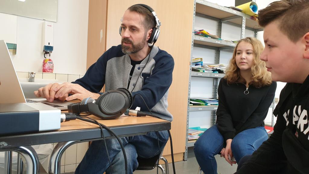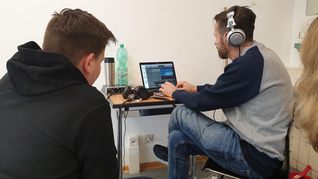 Tag 3: Es folgt das Aufnehmen des Songs mithilfe der Aufnahmetechnik. Währenddessen überlegen wir uns ein Cover und einen Titel. Wir hören uns das Ergebnis an und geben Feedback. Wir begrüßen Herrn Rodrigez von der HAZ und berichten ihm von unseren Projekt.