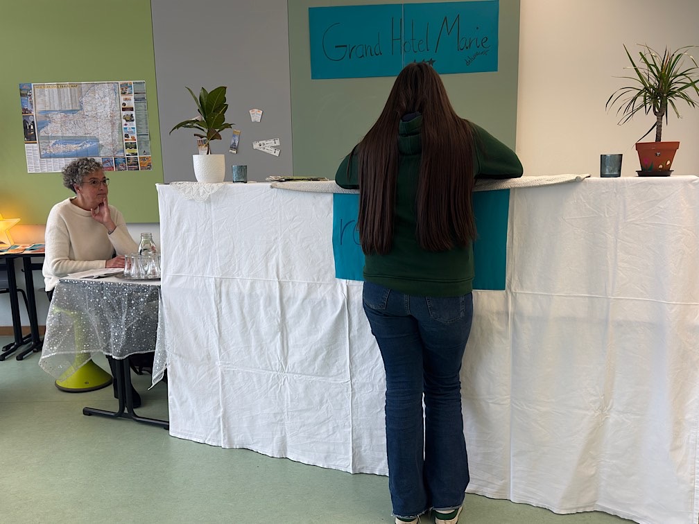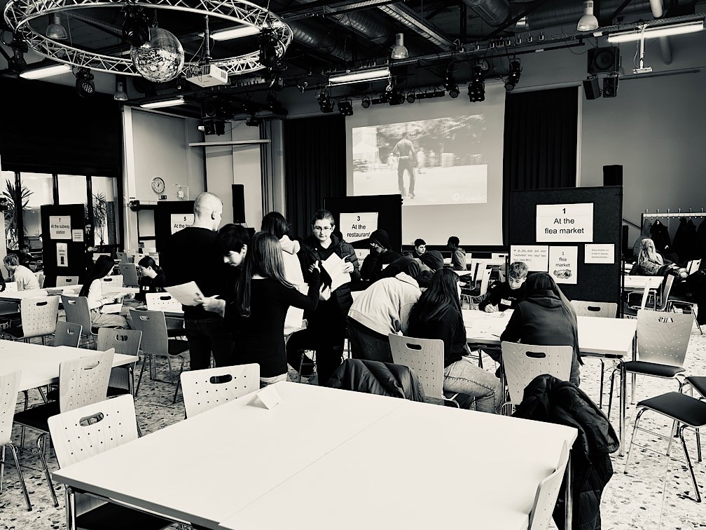 Die Schüler*innen der einzelnen Schulzweige hatten jeweils eine unterschiedliche Zahl an Situationen bzw. Aufgaben zu bewältigen, wobei sie die Themen und die Reihenfolge weitestgehend selbst wählen konnten. Für Schüler*innen des Hauptschulzweiges fand die Sprachenstadt in der 1. und 2. Stunde, für Schüler*innen des Realschulzweiges von der 3. bis 5. Stunde und für Schüler*innen des Gymnasialzweiges von der 3. bis 6. Stunde statt. Die Schüler*innen des 8. Jahrgangs haben die Gelegenheit, ihre fremdsprachlichen kommunikativen Fähigkeiten unter Beweis zu stellen, mit großem Engagement und viel Spaß wahrgenommen.
