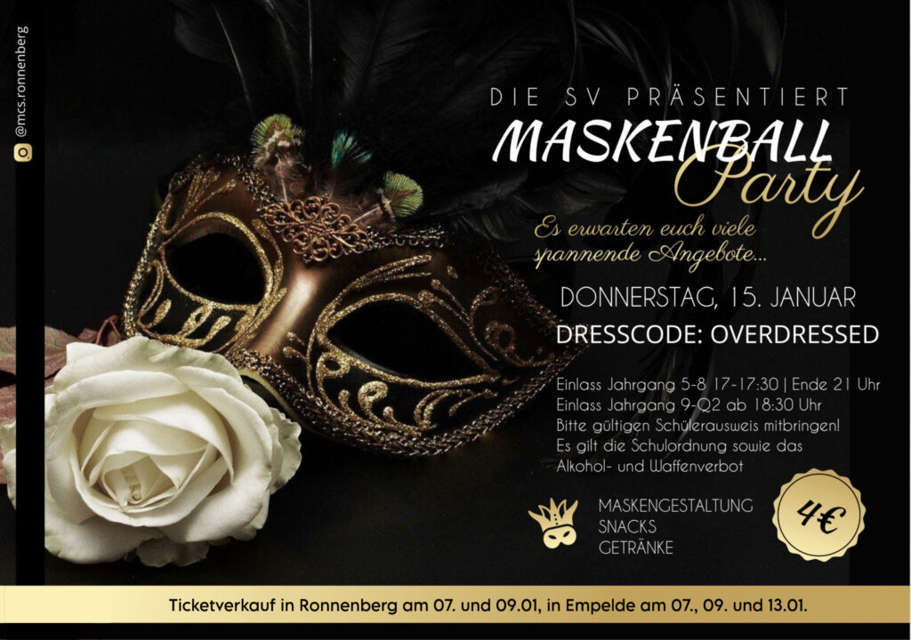 SV Party „Maskenball“ Veröffentlicht in 8. Januar 2026 Von X-Mr Die Schülervertretung läd zur SV-Party ein. Teilen:Klicken zum Ausdrucken (Wird in neuem Fenster geöffnet)